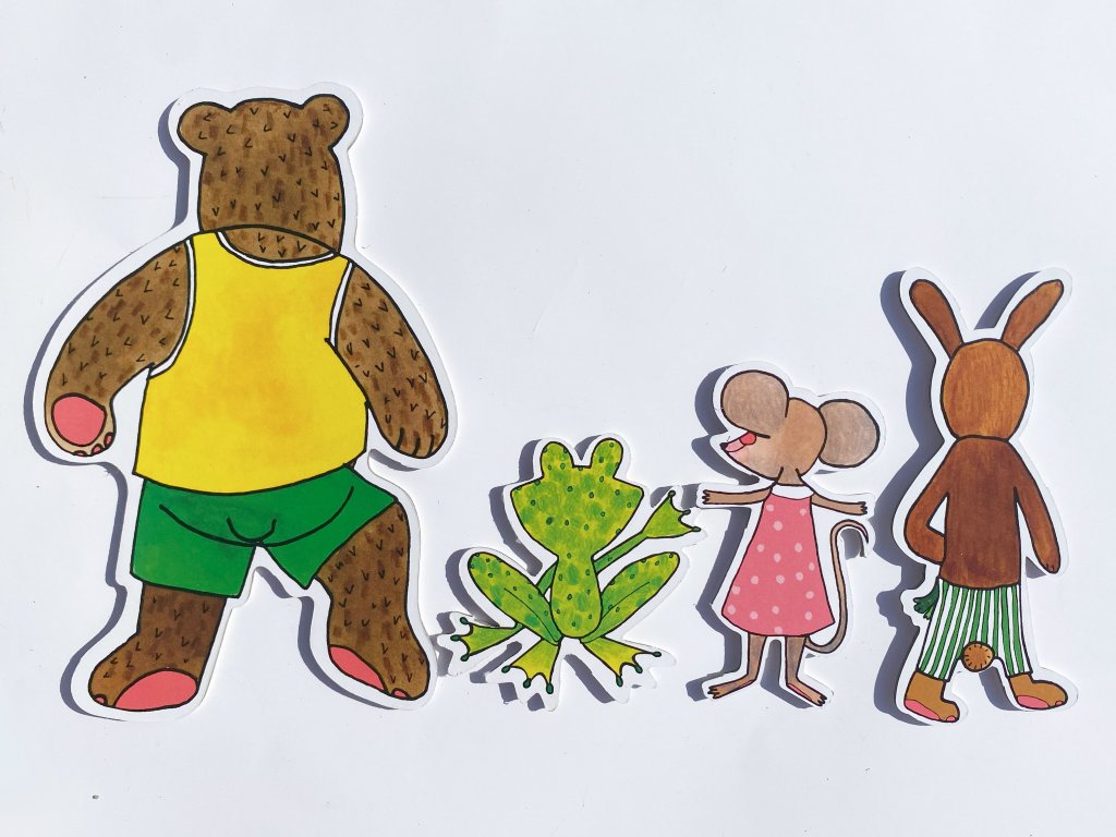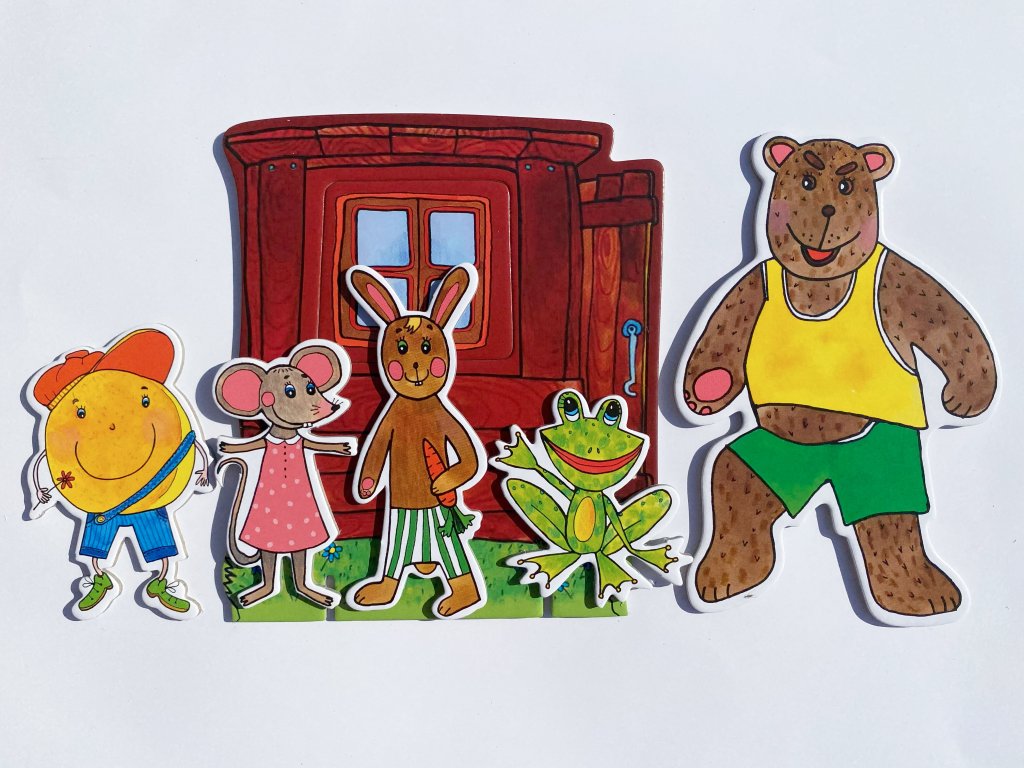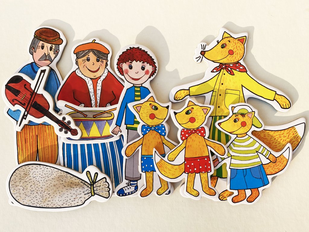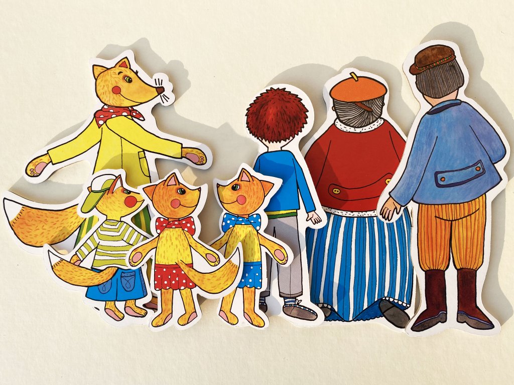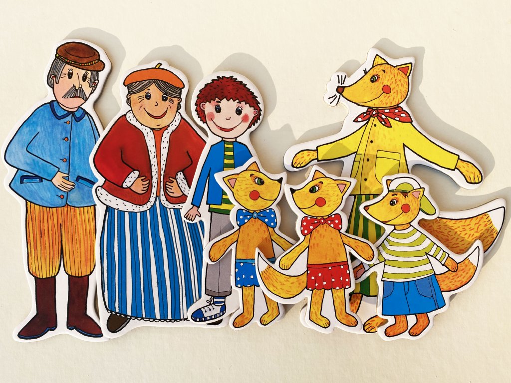 Budulínek, babička, dědeček, máma liška, 3 lištičky, myška, žabka, zajíc, medvěd, koblížek, pejsek, kočička, kohoutek, slepička, liška